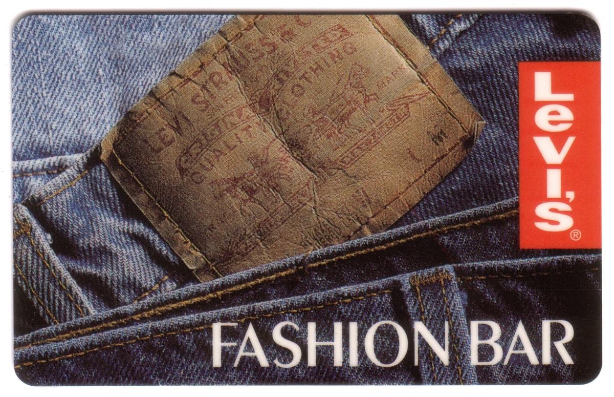 This collectible phone card prominently features corporate logos and trademarks related to Levi Strauss & Co., including the Levi’s brand name and references to Levi’s blue jeans. The card includes the text “15m Levi Jeans (Fashion Bar Department Store)” indicating its association with a 15-minute phone card denomination. The design incorporates branding elements tied to Levi’s, a well-known clothing company specializing in denim apparel. The card’s surface highlights Levi’s corporate identity with distinctive logos and trademarks used in advertising and marketing.
