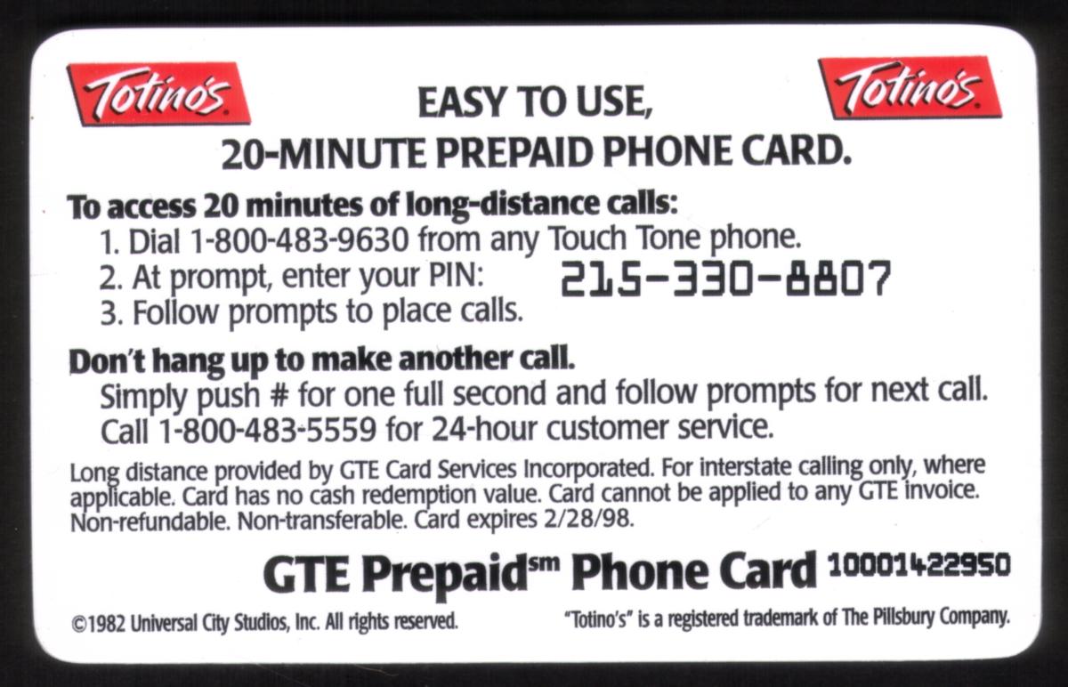 This phone card was issued by GTE Communications and references Totino's 20m, linking it to the collectible phone card series based on the movie "E.T. The Extra-Terrestrial." The depiction faithfully represents the special bond between Elliott and E.T., making this card a notable item for collectors of movie character memorabilia and science fiction-themed entertainment.
