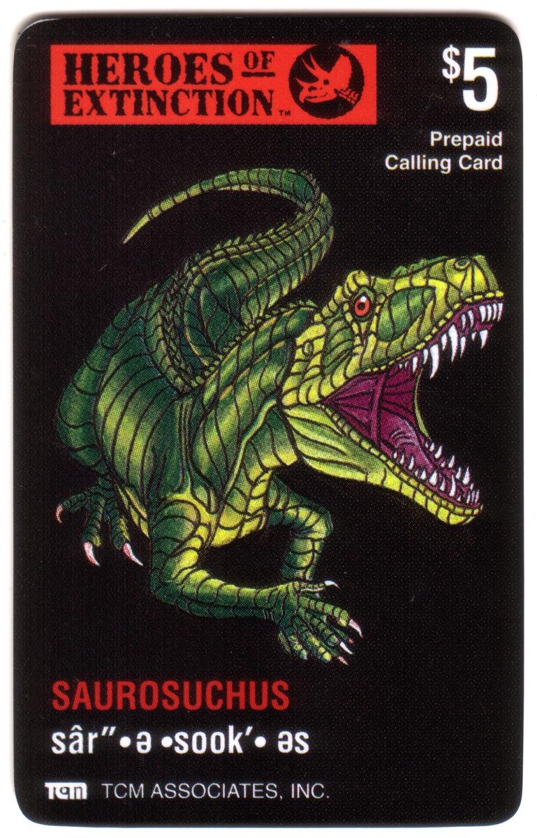 The card bears the title "Heros of Extinction: Saurosuchus Dinosaur" prominently near the bottom. Along the right side, the name "TCM Associates, Inc." is displayed vertically, identifying the issuing company. The value of the card is indicated as "$5" in green lettering near the upper left corner. The top right corner displays a rounded logo combining the letters "T" and "CM" within a shield-like design.