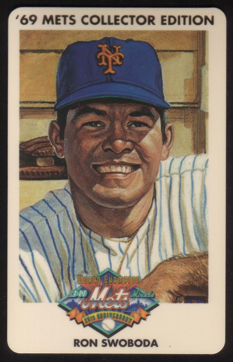 This collectible phone card features Ron Swoboda, a prominent player from the 1969 New York Mets team, widely known as the Miracle Mets. The card commemorates the 25th anniversary of the 1969 championship and displays Swoboda in his Mets uniform. The design incorporates the official 3M logo, linking it to the 1960s era of Major League Baseball. The background includes elements related to baseball and the Mets, emphasizing the historic nature of the team’s victory.
