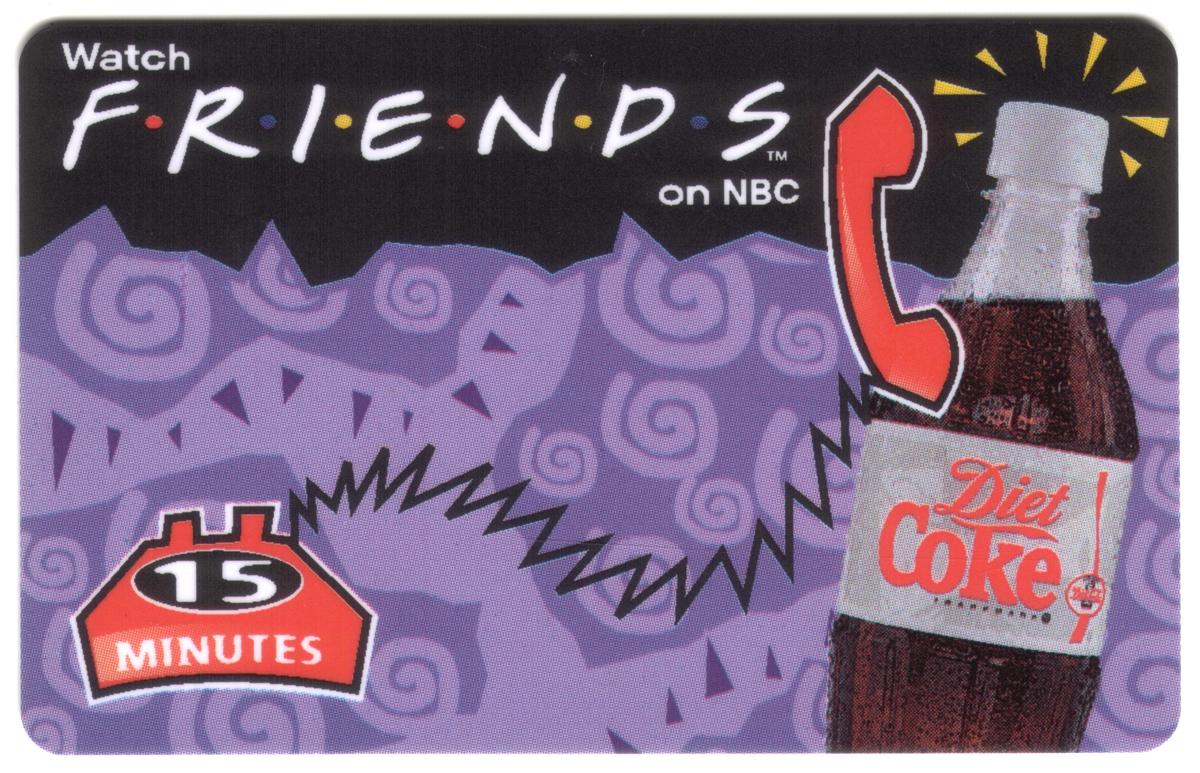 This phone card combines iconic elements from both the Diet Coke advertising campaign and the hit TV show Friends, highlighting the partnership through eye-catching cartoon-style art and colorful design. The TekTel and Century Telecom names are associated with the marketing of this card.