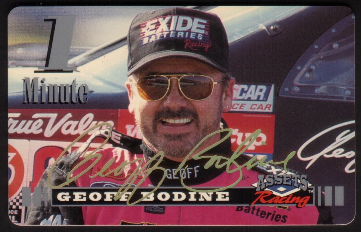 The card includes a printed signature of Geoff Bodine near the lower section, signed in blue ink-style text that appears as part of the design. The card is identified as a SPECIMEN edition, making it a unique collector’s piece. Additional graphic elements include the “1 Minute Geoff Bodine” text and a background that seems focused on auto racing themes, reinforcing the high-speed, competitive nature of the sport.
