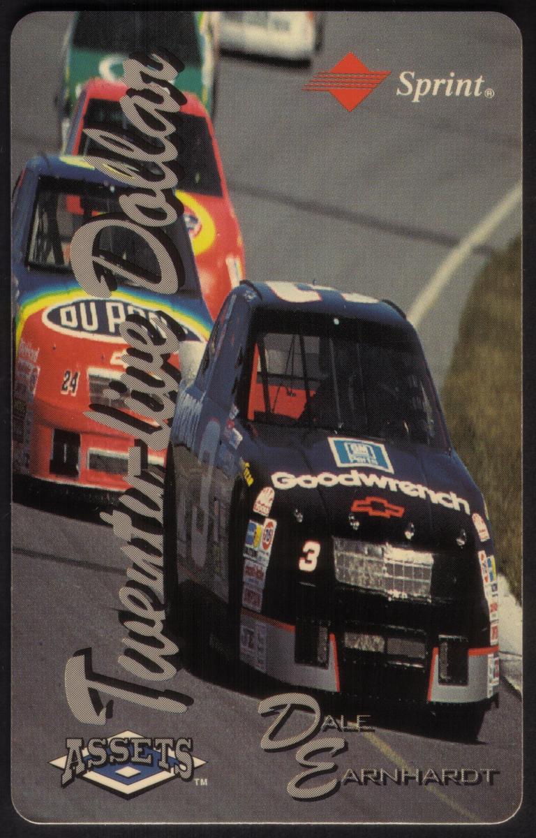 The card’s design includes stylized text reading “Twentieth-Hole Dallas” diagonally on the left side, and “Dale Earnhardt” at the bottom right in scripted font. The top right corner displays the Sprint logo in orange and white. The bottom left features the “Assets” series emblem, indicating it is part of a collectible series. This card is dated from the Assets Series #1 (1994) featuring Dale Earnhardt and Jeff Gordon autos.