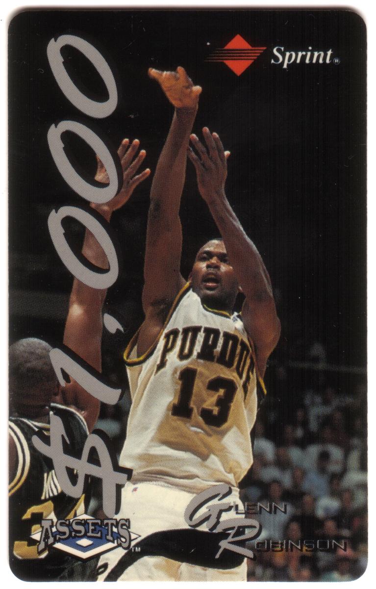 This collectible phone card features a dynamic basketball action image of Glenn Robinson wearing the Purdue University basketball jersey number 13. Glenn Robinson is shown mid-shot, aiming with his right hand extended upward, with a defender closely guarding him. The uniform is primarily white with black and gold trim, and "PURDUE" is clearly displayed across the chest.