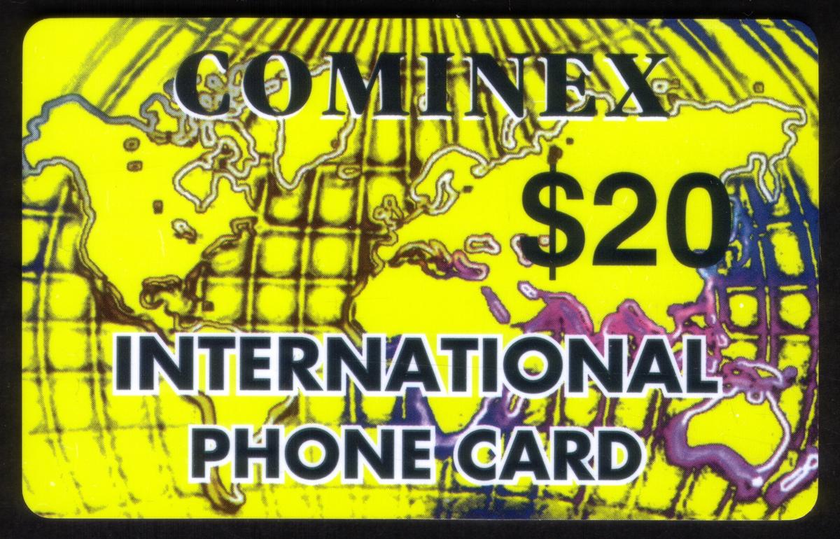 This is an international phone card with a $20 value issued by COMINEX. The card prominently features a world map set against a yellow background. The map is presented in an unusual or stylized design rather than a standard cartographic format, showing continents and countries in bold lines and solid color blocks. The country's shapes are clear and easily distinguishable, with an emphasis on bright and contrasting colors to highlight different regions.