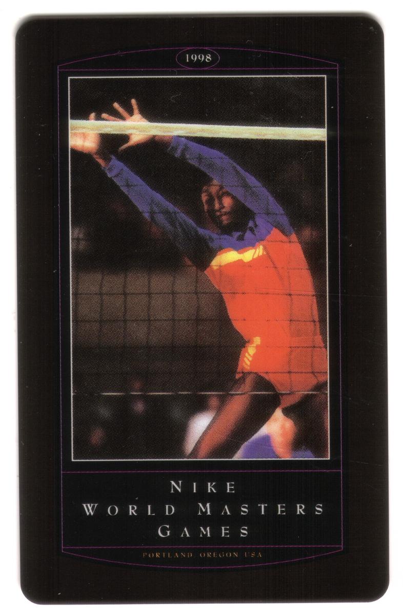This collectible prepaid card is from 1998 and features an image related to the Nike World Masters Games. The photograph shows a volleyball player in action, wearing a red-orange and purple uniform. The player is positioned near a volleyball net with hands raised, possibly attempting a block or a volley. The setting is indoors or dimly lit with a dark background, highlighting the athlete's focused expression and movement.