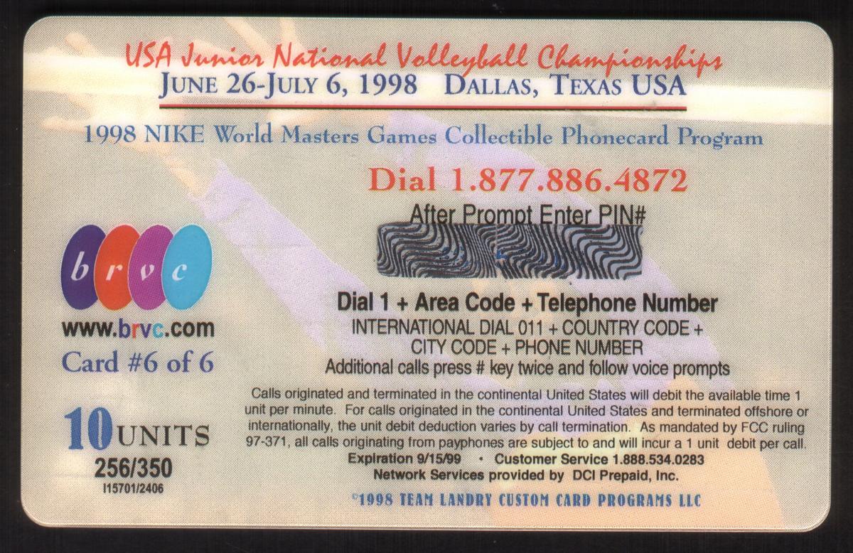 The keywords associated with this card include "dallas texas," "team landry," "dci prepaid," and "USA Junior National Volleyball," identifying it as a prepaid card issued by DCI and connected to volleyball sports events. The card is issued by BRVC Inc. and highlights the athletic spirit of the USA Junior National Volleyball team within the broader context of the Nike World Masters Games held in Portland, Oregon.