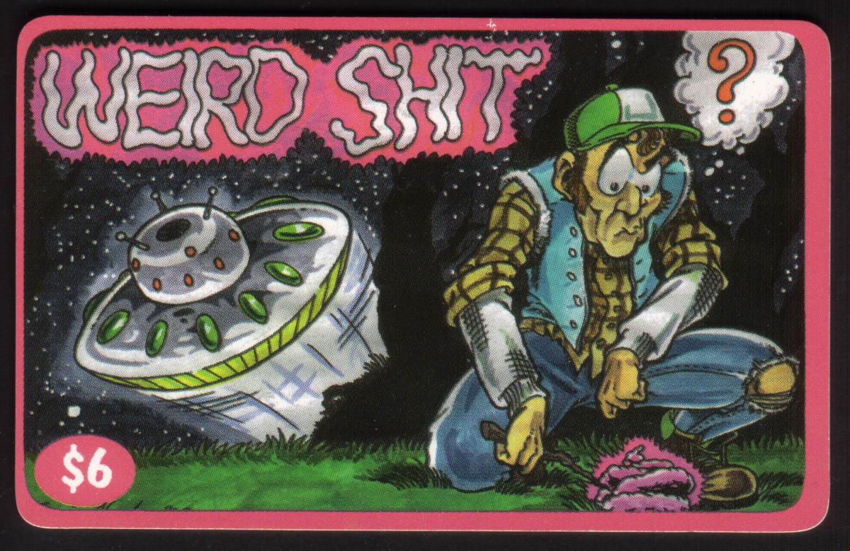 Prominently displayed near the middle of the card is the text "Weird Shit" and "Character Finding Weird Shit Left by Aliens Proof," along with the name "PhonLynx." These captions align with the artistic and alien-themed visuals. The card’s overall design uses bright colors and cartoon artistry to create an engaging and humorous representation of extraterrestrial encounters and strange discoveries.