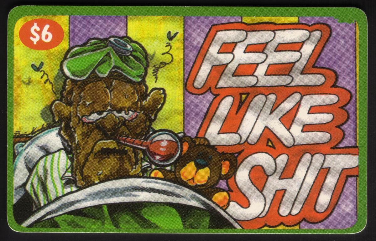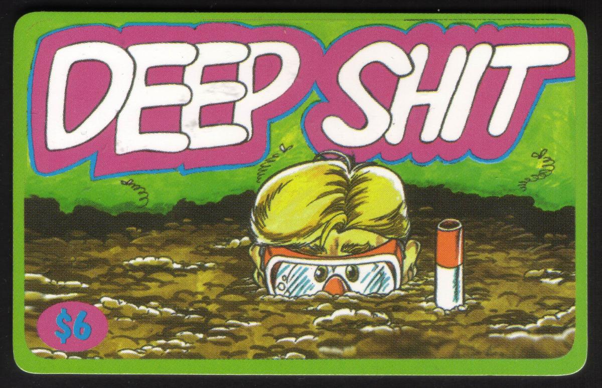 Among the highlights, the card titled "DEEP SHIT" shows a blond man wearing red goggles and partially submerged in a brown, muddy substance, with a cigarette standing upright beside him. The "DUMB SHIT" card depicts a red-haired man wearing glasses and a striped orange and white shirt, holding a yellow receipt or ticket with squiggly marks. "FEEL LIKE SHIT" portrays a tired man with goggles resting on his head, a thermometer in his mouth, and clutching a teddy bear as he leans over a green and purple striped background.