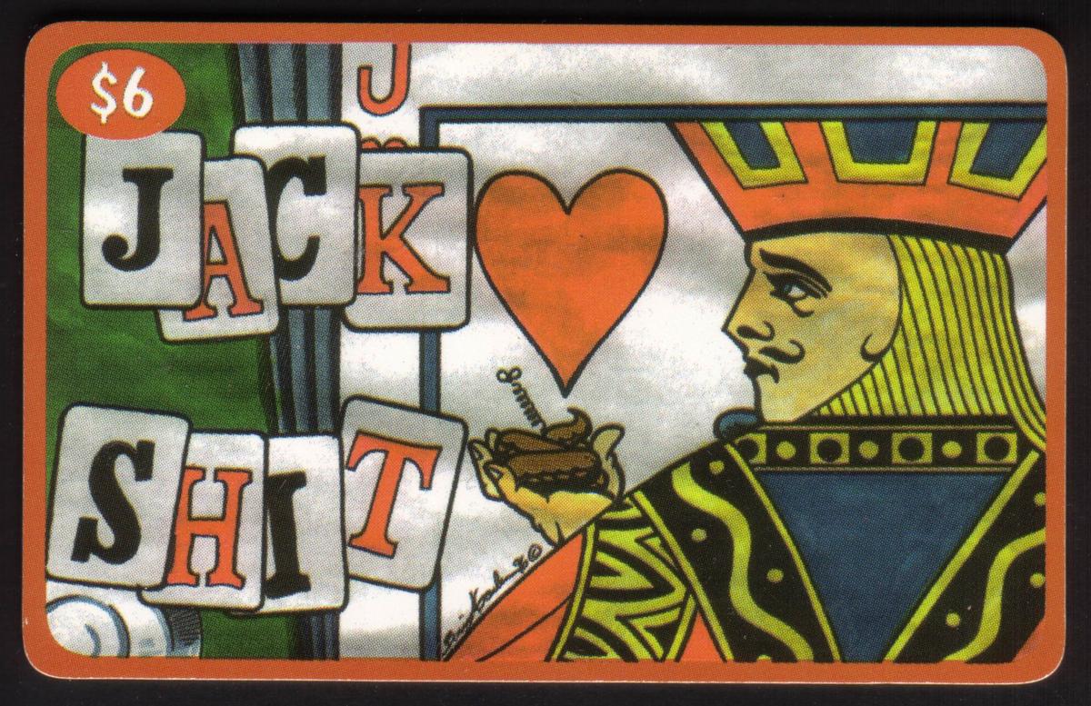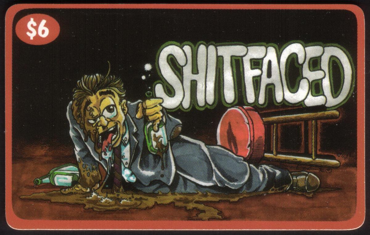 The cards also illustrate clever wordplay with images reflecting idioms, such as "JACK SHIT" paired with a king of hearts card and a cockroach, and "SHIT LUCK" showing a man with numerous injuries at a construction site labeled "MEN AT WORK." The "WEIRD SHIT" card shows a puzzled man near a flying saucer, and "SHITFACED" portrays a drunken man slumped on the ground surrounded by empty bottles.