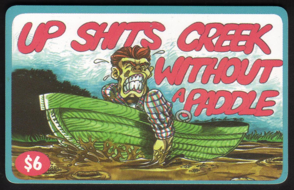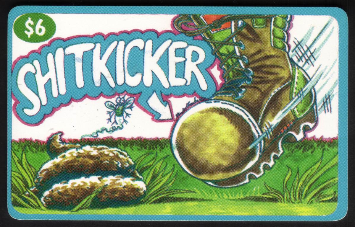 Other cards include dynamic scenes such as "SHIT A BRICK," where a man is running away terrified from a purple, clawed creature saying "Boo!!", and "SHIT FROM SHINOLA," showing a small man in space blasted backward by a giant meteor-like object. The "SHITHEAD" card features a muscular superhero character flying over a cityscape with the initials "SH" on his orange costume, while "SHITKICKER" shows a boot poised above a pile of dung on the grass. "UP SHITS CREEK WITHOUT A PADDLE" displays an angry man rowing an empty, green boat through turbulent waters.