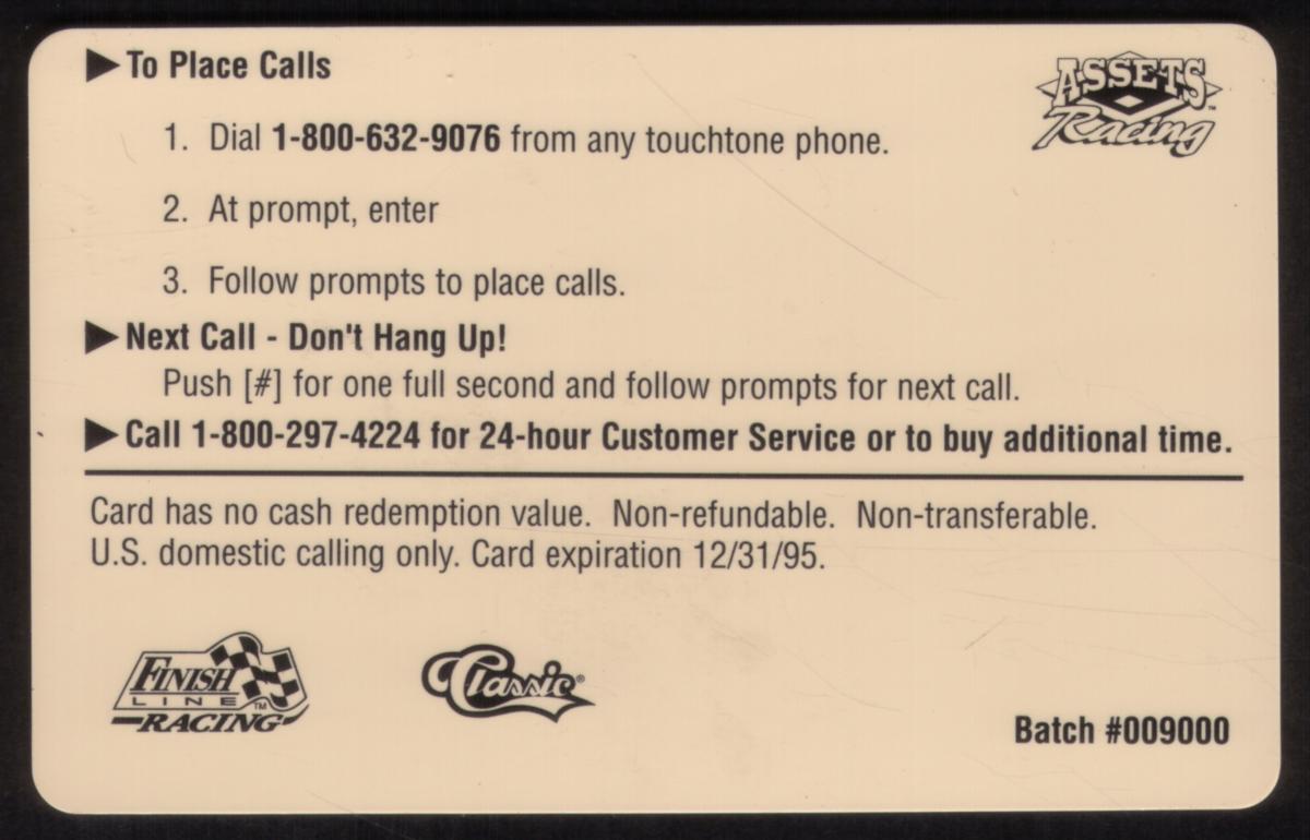 This phone card dates from 1995 and is part of the Assets Racing series, which focuses on auto racing and NASCAR themes. The card captures the essence of automotive racing and prominently highlights John Andretti’s association with the sport.