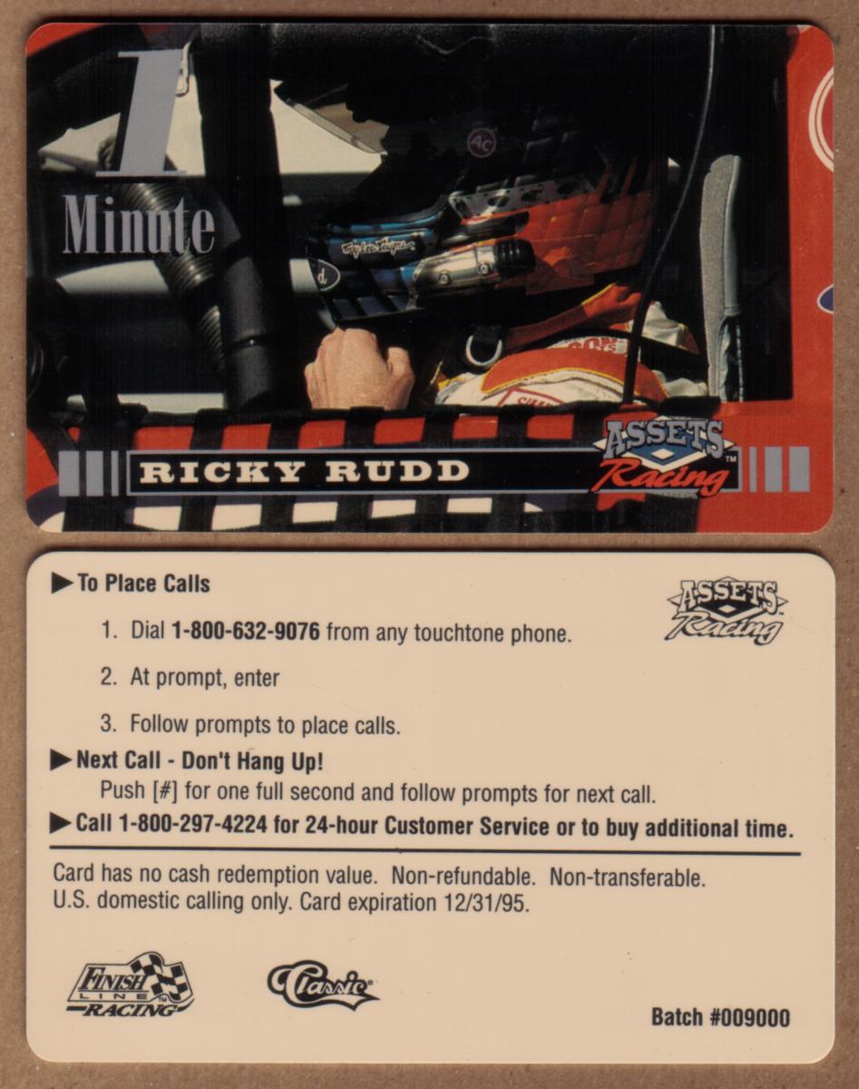 This collectible card features a vivid depiction of NASCAR driver Ricky Rudd’s race car from the 1995 season. The image prominently displays the car speeding on the racetrack, showcasing its detailed paint scheme dominated by the Assets Racing colors and logos. The design incorporates corporate trademarks and sponsor branding, including the recognizable Troy Lee Designs logo. The card includes text identifying it as "1 Minute Ricky Rudd SPECIMEN," linking it directly to Finish Line Racing and emphasizing its official nature. The background of the image captures the racetrack environment, enhancing the card's dynamic automotive theme.