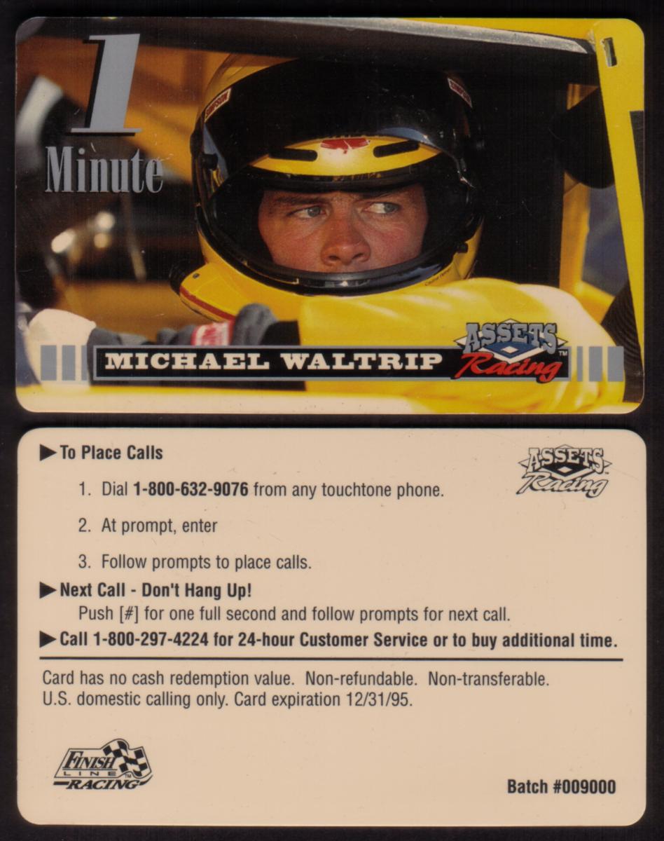 The card is titled "1 Minute Michael Waltrip SPECIMEN" and belongs to the Assets Racing 1995 series produced by Finish Line Racing. The design incorporates sharp, vibrant colors with clear branding that connects it to the world of NASCAR and the collectible auto racing memorabilia field. Text on the card includes Michael Waltrip’s name and mentions the year, 1995, reinforcing the historical context of this racing collectible.