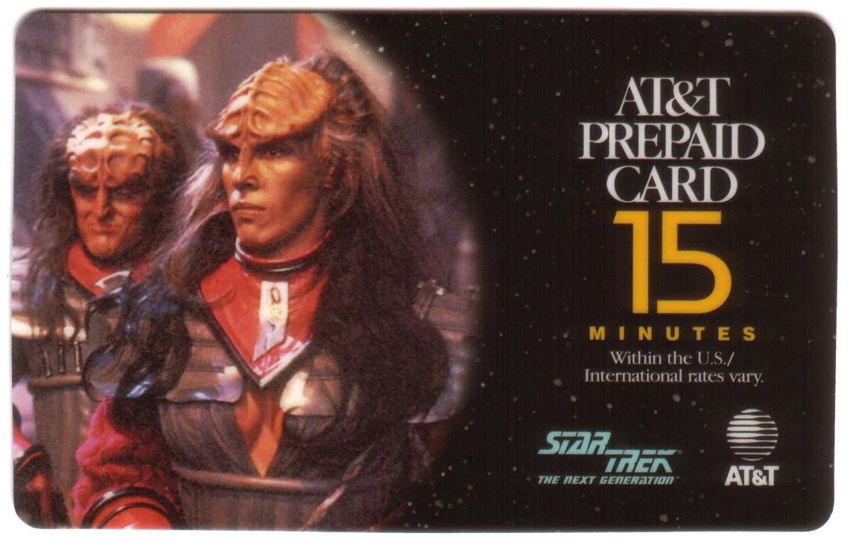 The top right corner of the card includes the official *Star Trek: The Next Generation* branding with the abbreviation "TNG," which identifies the series. The card also bears logos for AT&T and WorldCom, indicating a corporate collaboration or sponsorship. The word "SPECIMEN" is printed near the center, indicating the card’s status, and the card carries a 15-minute usage designation, implying it was originally intended for telecom usage. The imagery and text clearly associate the card with the sci-fi and fantasy genre, particularly highlighting the iconic Klingon species from *Star Trek* lore.