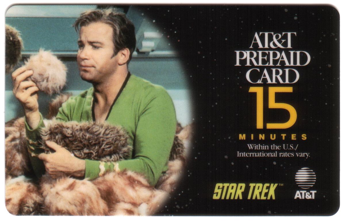 This AT&T phone card celebrates the iconic television series and the memorable episode involving Captain Kirk and the Tribbles. Featuring William Shatner’s likeness and the recognizable Tribbles, the card reflects its connection to classic sci-fi entertainment and the Star Trek universe.