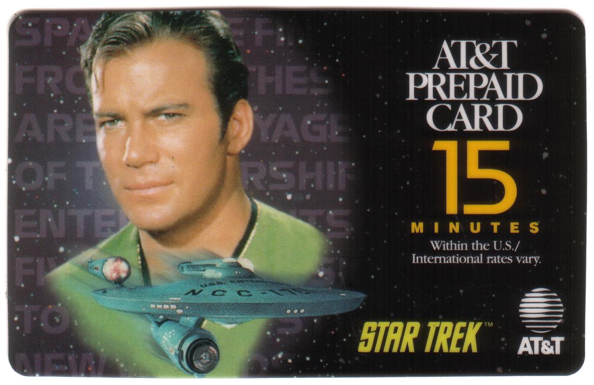 The design incorporates visual elements connected to space and entertainment, highlighting the legacy of Star Trek as a major film and television franchise. The combination of William Shatner's likeness and the Starship Enterprise firmly associates the card with the series' cultural impact in science fiction and fantasy art. The AT&T logo is visible, confirming the card’s issuance by the telecommunications company.