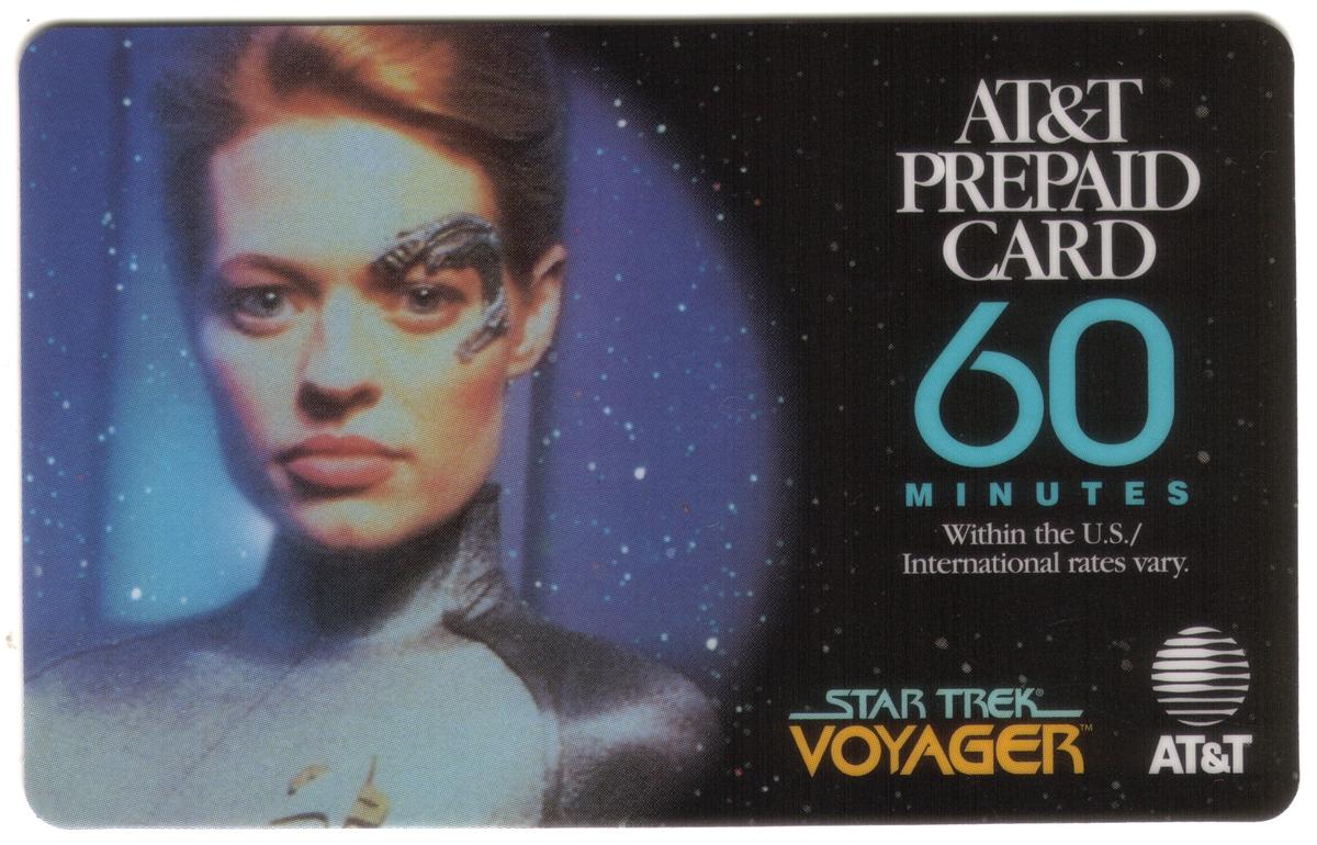 Additional text at the bottom of the card includes the words "Star Trek: Female Character 'Seven of Nine' on Voyager" which confirms the subject and the television series. The overall presentation connects to genres including science fiction, entertainment, movies, TV, and fantasy, emphasizing the collectible nature tied to Star Trek's depiction of space exploration and iconic characters.