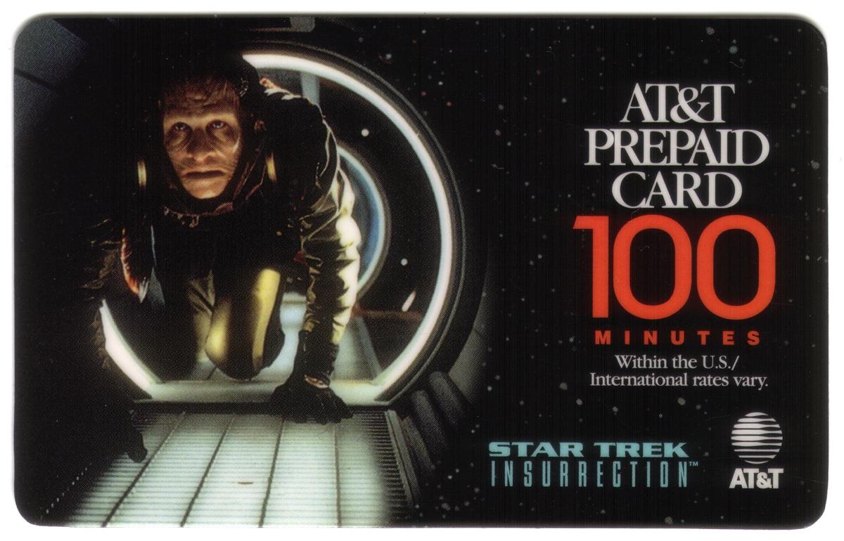 The card is marked with "SPECIMEN" and includes the AT&T logo, linking it to telecommunications branding. The design incorporates elements referencing movies, TV, and stars within the sci-fi and fantasy art genres. The overall presentation focuses on the iconic status of Michael Dorn within the Star Trek saga and the 100 million dollar production scale of "Star Trek: Insurrection."