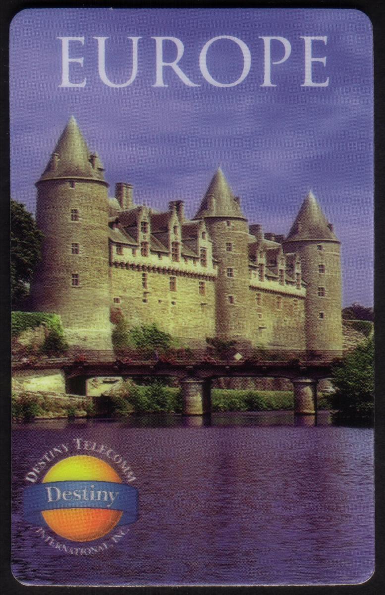 The card includes the text "Destiny Telecomm" positioned on the lower right, indicating the issuing telecommunications company. The value of the phone card is 2400 units, printed in the upper left corner in white font over a dark background strip. The word "Europe" appears at the top center in a golden serif font, emphasizing the card’s thematic focus on European landmarks.
