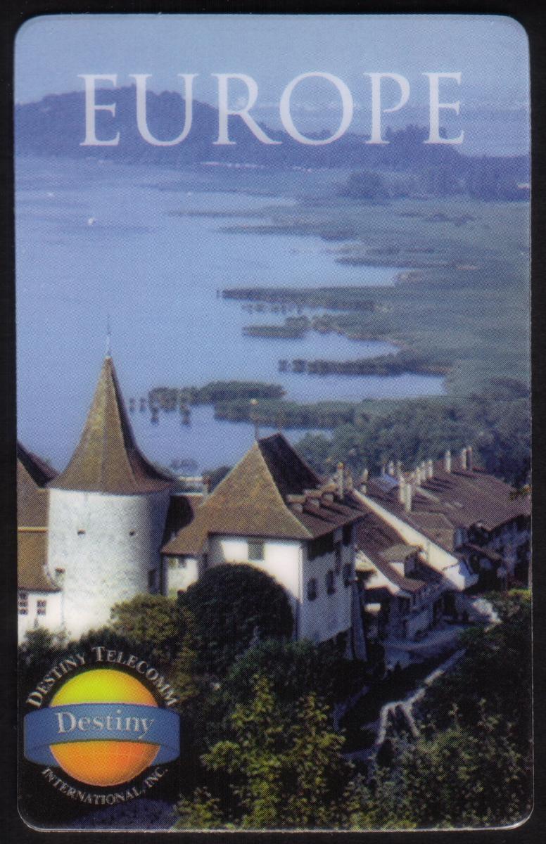 The card includes text indicating "Europe" prominently placed, linking the scene explicitly to the European region. Additional text elements include "Chalet On The Coast" in a bold font, identifying the subject of the image. The card displays the name "Destiny Telecomm," indicating the issuer or telecommunications brand associated with this specimen card.
