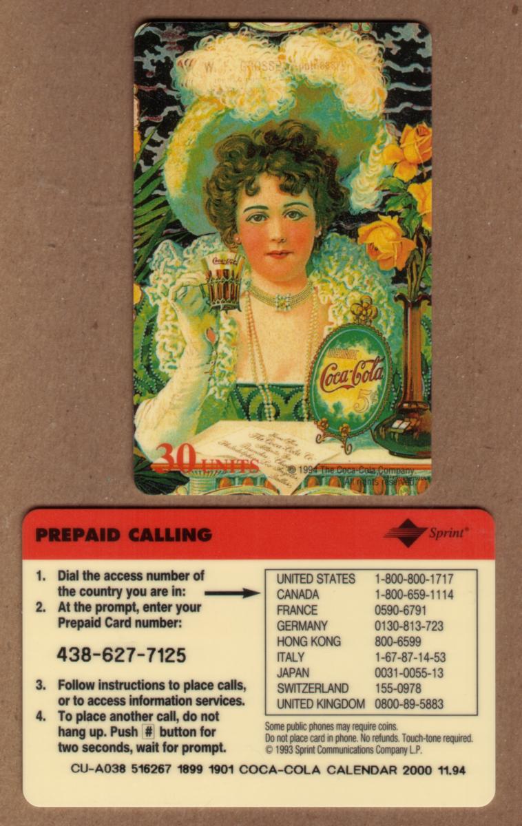 This collectible phone card features a classically dressed young lady from the year 1901, as depicted in a Coca-Cola calendar image. The woman has curly brown hair styled up and wears a white feathered hat with a large plume and floral decoration. Her attire includes a white lace top with a high collar adorned with pearls and a choker necklace. She holds a glass filled with Coca-Cola in her gloved right hand, with the glass and beverage clearly visible.