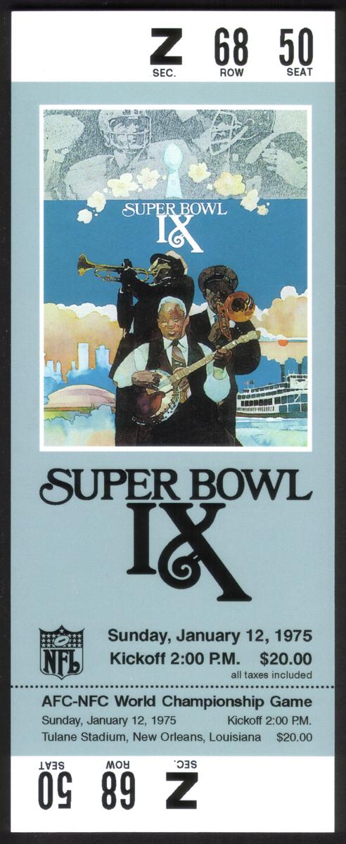 The top portion of the ticket displays seating information: Section Z, Row 68, and Seat 50. Below the artwork, "SUPER BOWL IX" is printed in large, bold lettering. The official NFL logo is present near the bottom left corner of the ticket.