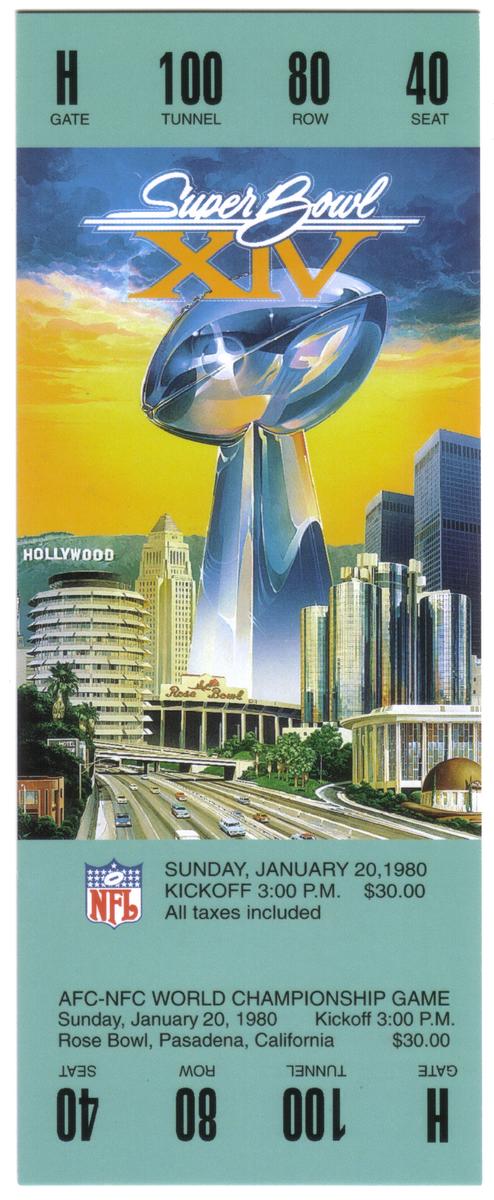 Key text details on the card state the event date and time as Sunday, January 20, 1980, with a kickoff at 3:00 PM. The game took place at the Rose Bowl in Pasadena, California. The ticket price is listed as $30.00 with all taxes included. Seating information places this ticket in Gate H, Tunnel 100, Row 80, Seat 40. The lower portion of the card includes the official NFL logo and mentions the Pittsburgh Steelers and Los Angeles Rams as the competing teams for Super Bowl XIV.