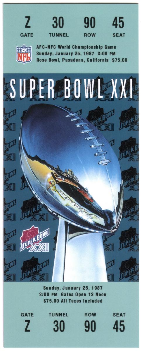 This set of four collectible cards features ticket replicas for Super Bowl events XXI through XXIV, each with vivid artwork and detailed event information printed on the front. The Super Bowl XXI card is blue and prominently displays a large silver Vince Lombardi Trophy against a background patterned with the NFL and Super Bowl XXI logos. Above and below the trophy image are details including the gate (Z), tunnel (30), row (90), and seat (45), along with the date and location: Sunday, January 25, 1987, at the Rose Bowl in Pasadena, California. The ticket price is marked $75.00.