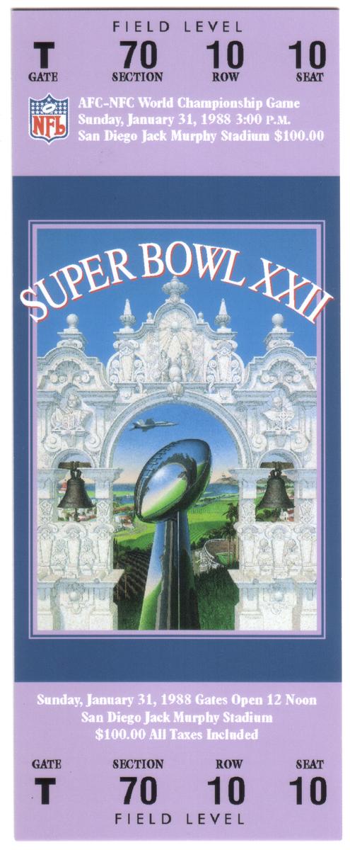 The Super Bowl XXII ticket replica is purple and shows an artistic rendering of the Vince Lombardi Trophy in front of a classical white architectural facade with four bells. It includes ticket details at the top with gate T, section 70, row 10, and seat 10. The event took place on Sunday, January 31, 1988, at the San Diego Jack Murphy Stadium, and the ticket price is $100.00.