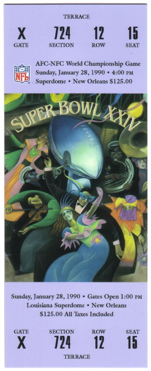 The ticket replica for Super Bowl XXIV is lavender with a surreal, somewhat abstract artistic composition featuring the Vince Lombardi Trophy surrounded by vibrant Mardi Gras-themed elements, including a jester figure and musical instruments. Ticket details include gate X, section 724, row 12, seat 15. The event was held Sunday, January 28, 1990, at the Louisiana Superdome in New Orleans, with a ticket price of $125.00.