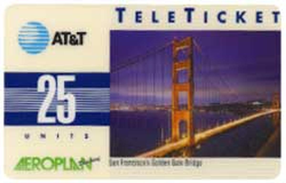 Printed text on the card includes "San Francisco CA" and "San Francisco’s Golden Gate Bridge" indicating the location and subject clearly. The card is issued by AT&T as part of their Teleticket series, which is referenced by the text "teleticket 25u AeroPlan" on the card’s surface. The word "SAMPLE" appears in large, transparent lettering across the design, and "German" is noted, suggesting the language or edition of this card. The AT&T logo is present in the lower portion of the card’s face.