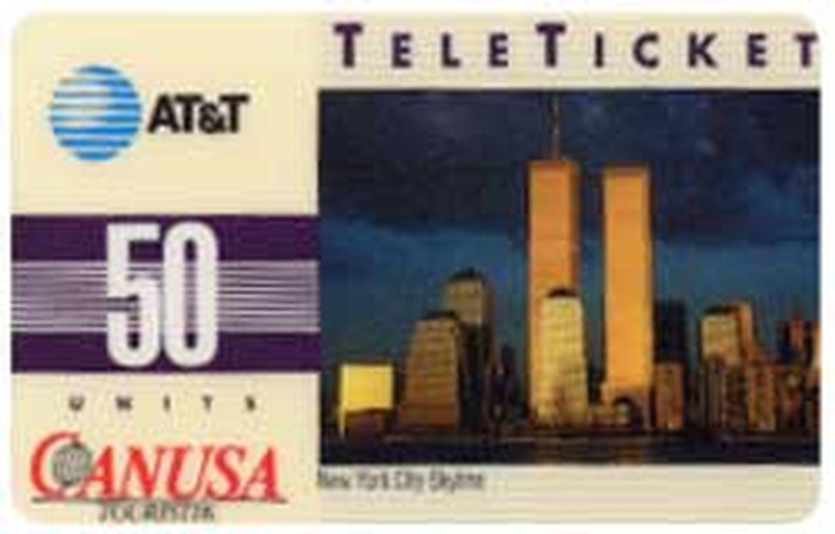 The card contains clear text indicating "WTC CANUSA: 50u" and includes references to New York City (NYC), the World Trade Center (WTC), the Twin Towers, 9/11, and teleticket use. The wording "AT&T" appears on the card, signifying the phone card’s issuer. The overall design centers around the historical and sightseeing significance of the World Trade Center as an essential part of the NYC skyline.