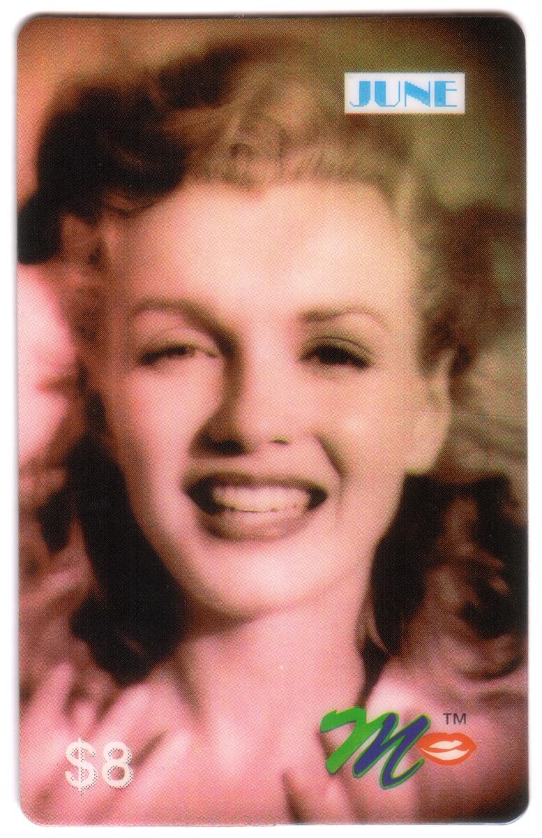 This collectible phone card features a black-and-white close-up photograph of Marilyn Monroe's face. The image captures Marilyn's distinctive beauty with clear detail, focusing on her eyes, nose, and lips. The lighting highlights the contours of her face, emphasizing her iconic look with soft shadows.