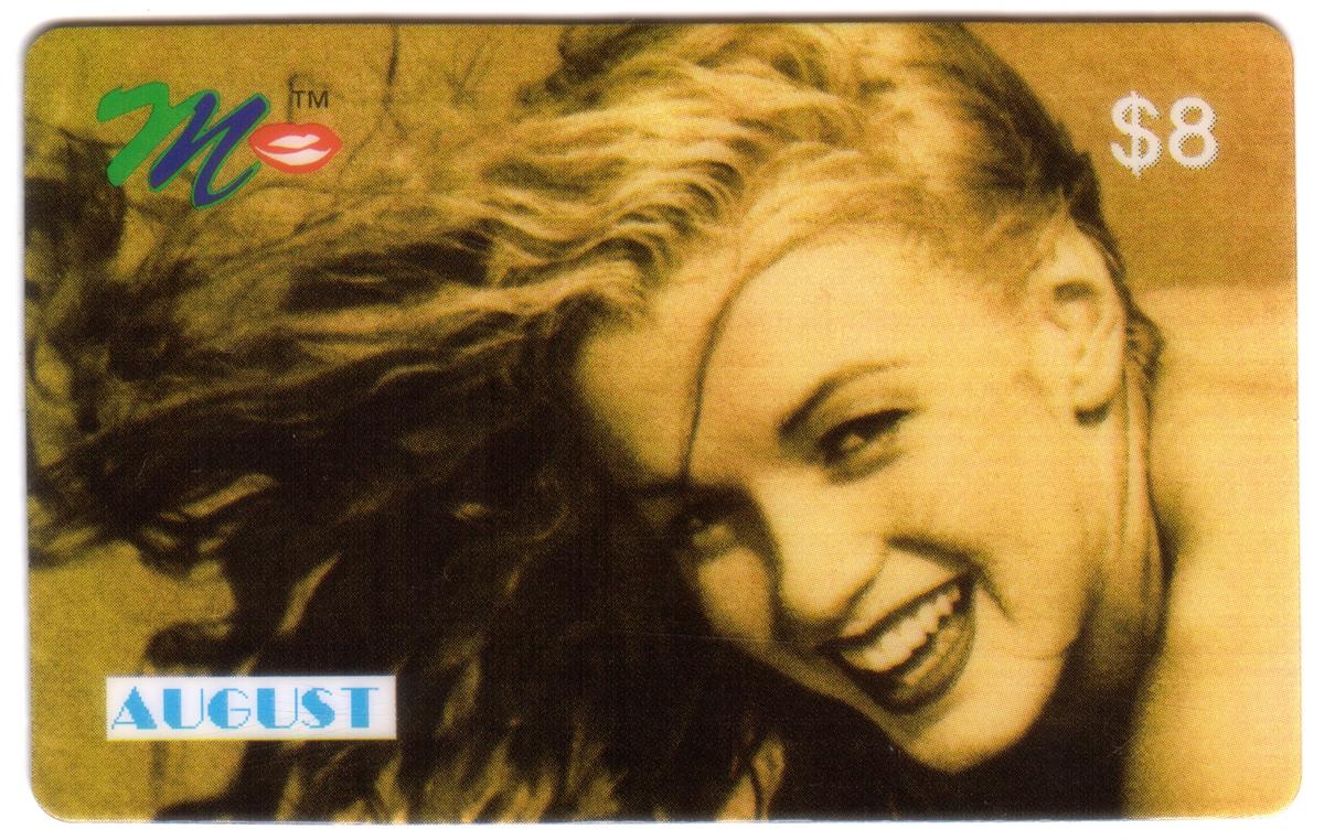 This collectible card features a black and white close-up photograph of Marilyn Monroe, also known as Norma Jeane. The image captures Marilyn’s face prominently, highlighting her wild hair and iconic beauty. The design includes the text "Marilyn in August" along with the value notation "$8" printed on the card. The card also displays the words "Laser Radio" indicating the issuing entity or series.
