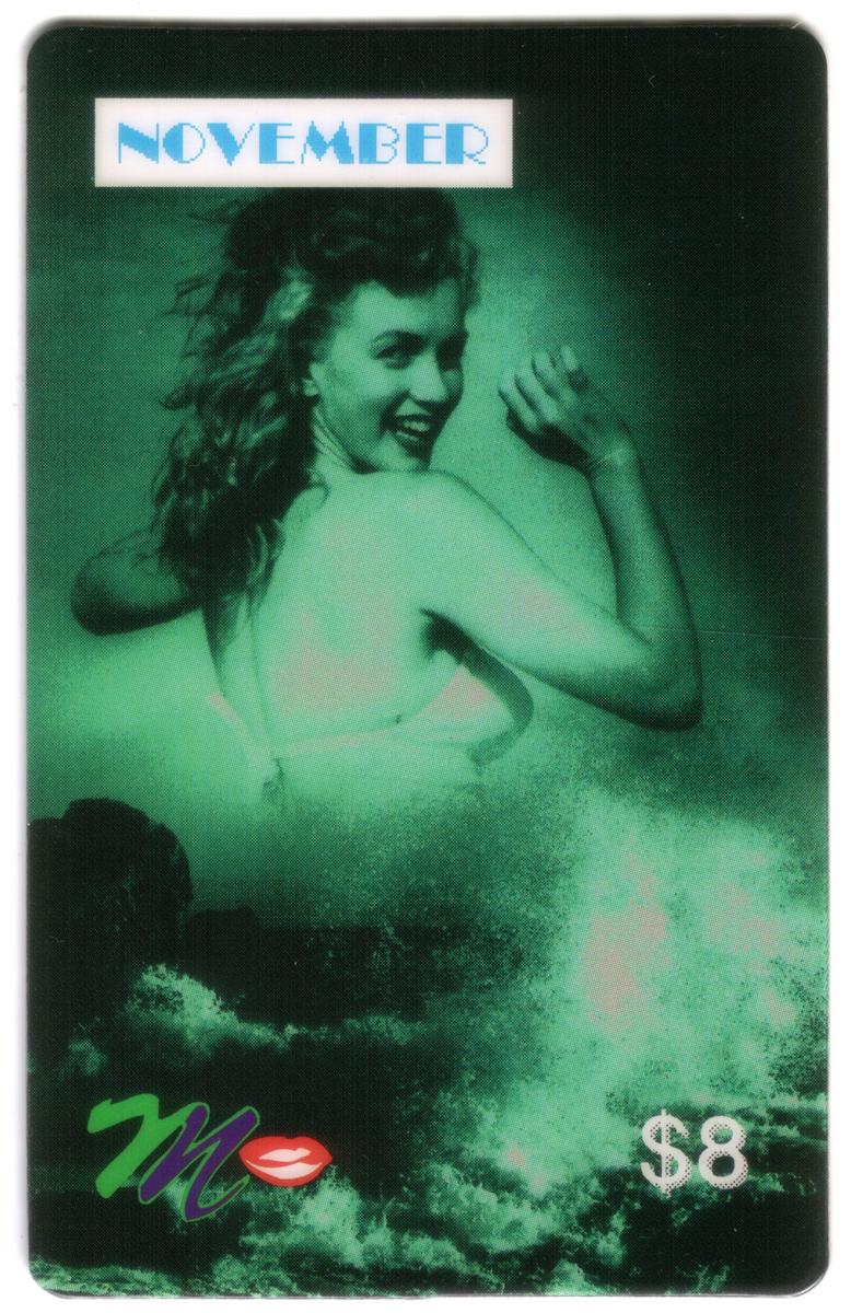 This collectible phone card features a black-and-white photograph of Marilyn Monroe at the beach. Marilyn is depicted splashing water and smiling, capturing a joyful and candid moment. The image shows her in a swimsuit, with ocean water around her, creating a dynamic and lively scene.