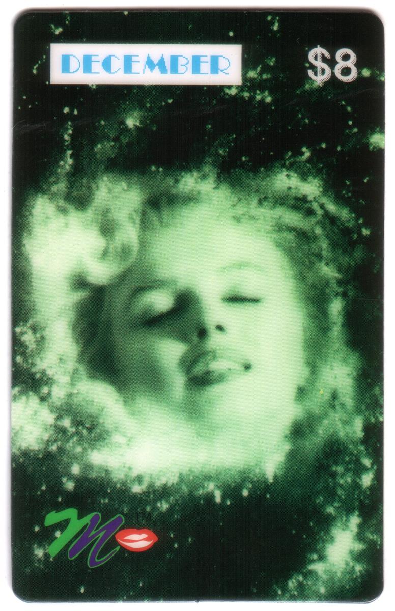 The card includes the text "Marilyn in December" and the denomination "$8" printed clearly on its surface. The design incorporates a Laser Radio logo, indicating an association with this company. The layout uses clean, minimalistic elements that draw attention to Marilyn Monroe as the central subject.