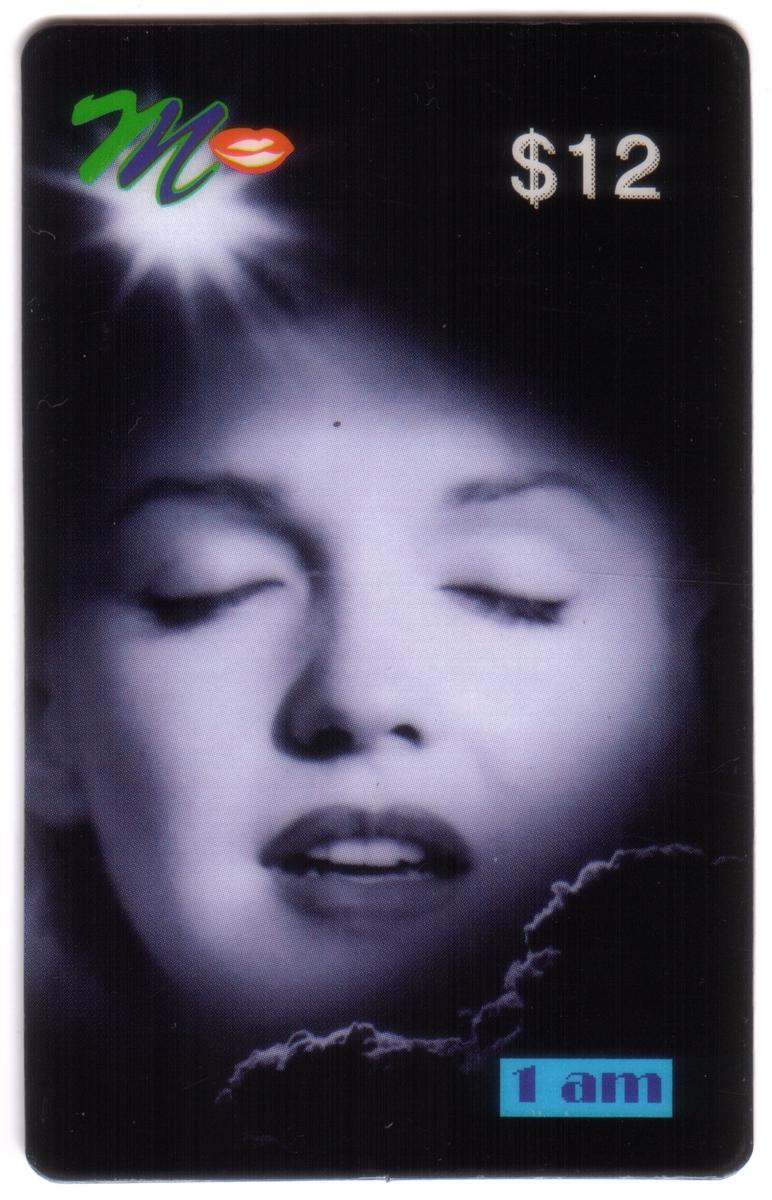 This collectible phone card features a close-up image of Marilyn Monroe, also known by her birth name, Norma Jeane. The detailed photograph captures Monroe’s face in a moment of rest, appearing to be falling asleep at nighttime. The lighting emphasizes her iconic features, highlighting her pale skin, classic makeup, and softly closed eyes. The image has a serene and intimate atmosphere, focusing solely on Marilyn Monroe’s face.