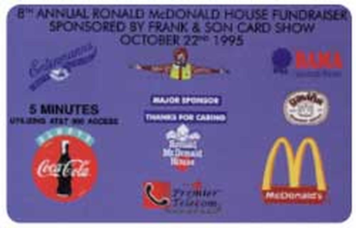 Commemorative card for the 8th Ronald McDonald House fundraiser, featuring sponsor logos, Ronald McDonald illustration, and a 5-minute AT&T calling feature. |