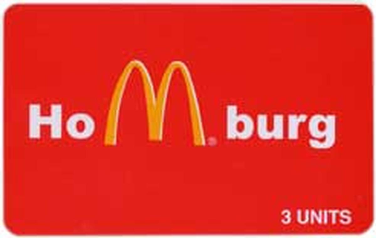 This collectible phone card features the McDonald's Golden Arches logo prominently displayed in the center against a white background. The words "McDonald's" appear below the arches in bold, black letters. The design includes the location name "Homburg," indicating the German city associated with this card. The McDonald's logo and branding emphasize the global fast-food chain known for its restaurants and fundraisers.