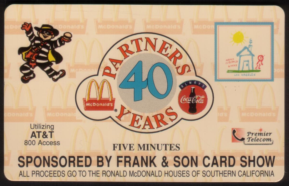 This collectible phone card commemorates the 40 years of partnership between McDonald's and Coca-Cola. The card prominently features the number "40" in blue within a central circular design, flanked on the left by the McDonald's Golden Arches logo and on the right by a classic Coca-Cola bottle silhouette accompanied by the word "Always." Surrounding this emblem is the phrase "PARTNERS YEARS" in red lettering.