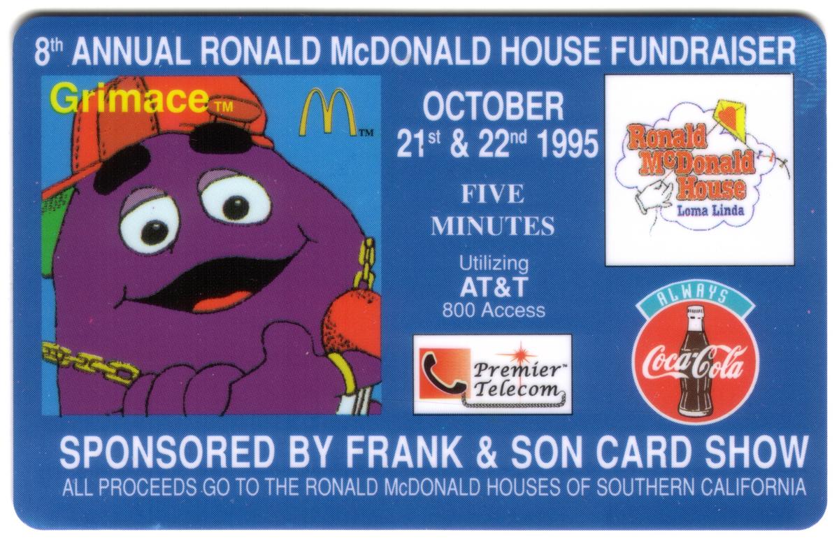 The card indicates a five-minute usage period and specifies access through AT&T 800 services. It is sponsored by the Frank & Son Card Show, with a note that all proceeds support the Ronald McDonald Houses of Southern California. The Premier Telecom logo is also present, highlighting its involvement in the card’s telecommunications service.