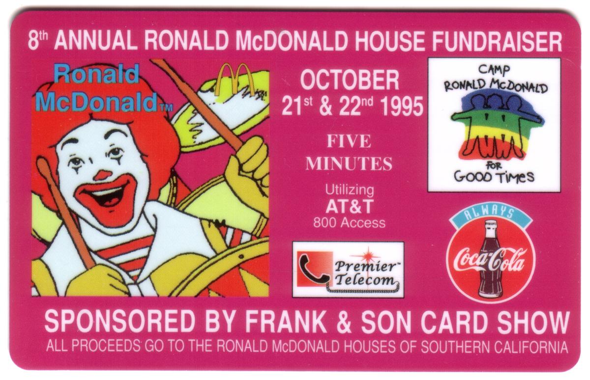 The card promotes a five-minute calling duration utilizing AT&T 800 access and identifies Premier Telecom as the telecommunications provider. Text at the bottom states that the event is sponsored by the Frank & Son Card Show and that all proceeds benefit the Ronald McDonald Houses of Southern California. Additional logos on the right side include the “Camp Ronald McDonald for Good Times” logo, depicting a colorful house with several cartoon figures inside, and the “Always Coca-Cola” logo featuring a classic glass Coca-Cola bottle with a red circular background.
