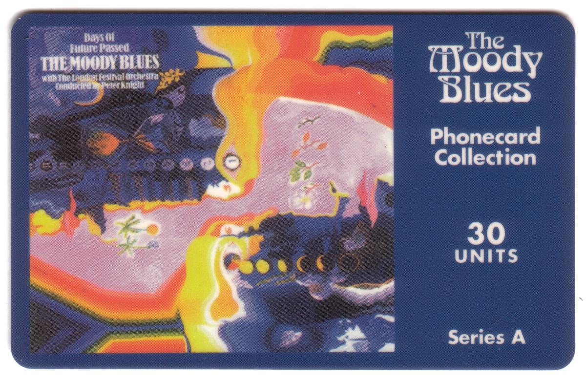 This collectible item features The Moody Blues Series 'A' titled "Days of Future Past," part of a creative communication set related to entertainment, music, and rock bands. The design highlights The London Festival Orchestra with Peter Knight as the conductor. The front of the card displays artistic elements connected to the band and orchestral collaboration, emphasizing the fusion of rock music and orchestral arrangements.