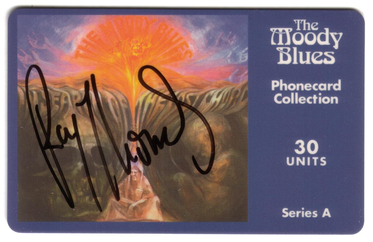 The overall design uses vibrant colors and abstract shapes, capturing a vintage, artistic vibe aligned with the album's theme and the band’s iconic style. The visual presentation, combined with the signature and clear references to The Moody Blues album, makes the card a distinctive collectible item for fans of rock music and the band’s history.