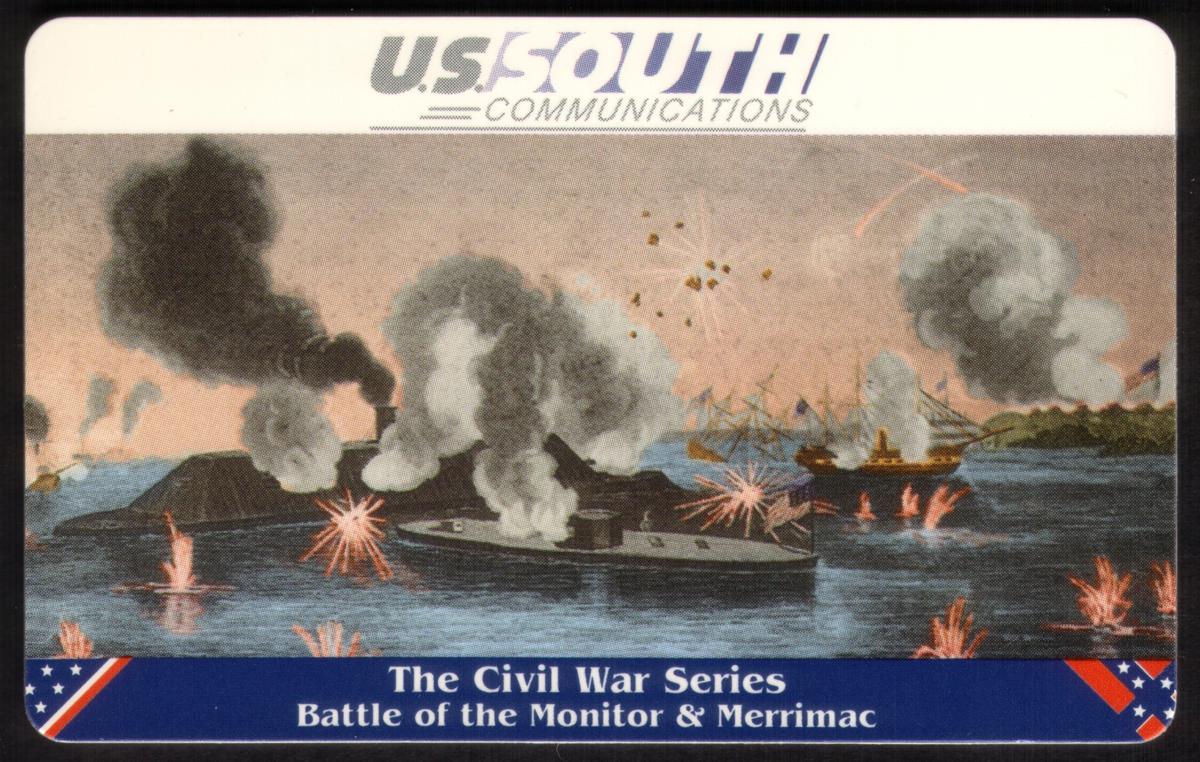 The bottom of the card displays a dark blue banner with the Confederate battle flag motif at each corner. The text within the banner reads: "The Civil War Series Battle of the Monitor & Merrimac." At the top center, the card is branded "U.S. SOUTH COMMUNICATIONS" in bold lettering, with “U.S. SOUTH” highlighted in a larger font.