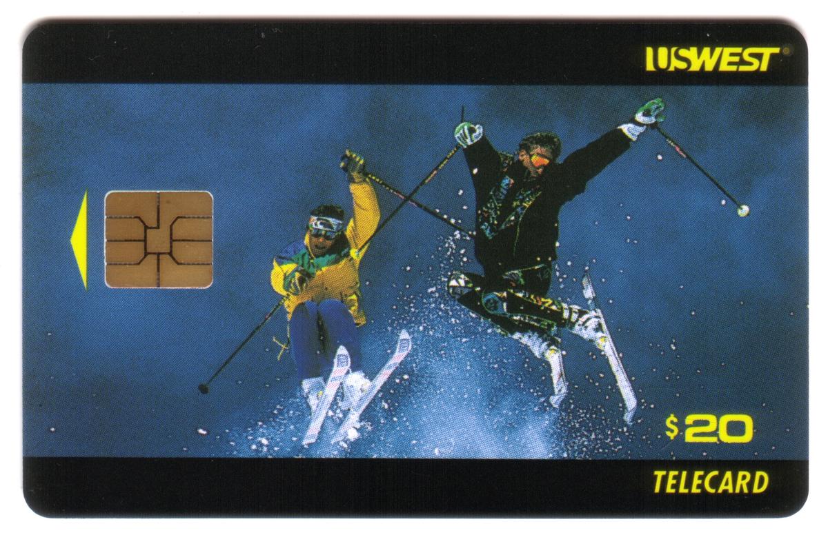 The overall design uses a blend of photographic detail and graphic elements to emphasize the excitement of winter sports. The skiers’ uniforms and equipment are precise and realistic. The card is rectangular with a gold chip embedded on the left side, consistent with chip-enabled collectible phone cards. The visual focus and typography align to celebrate skiing as an athletic and scenic adventure under the U.S. West Communications brand.