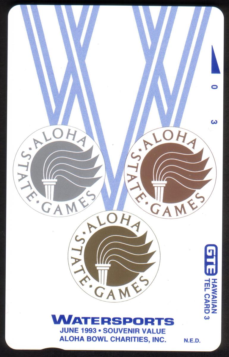 The top right portion of the card displays the text "Aloha State Games," with "1993" prominently placed below, reinforcing the year of the event. Adjacent to this text, the logo for GTE Hawaiian Telephone is clearly visible, identifying the company’s sponsorship or involvement with the event. The designation "Sports: other" confirms watersports as the featured category for these medals.