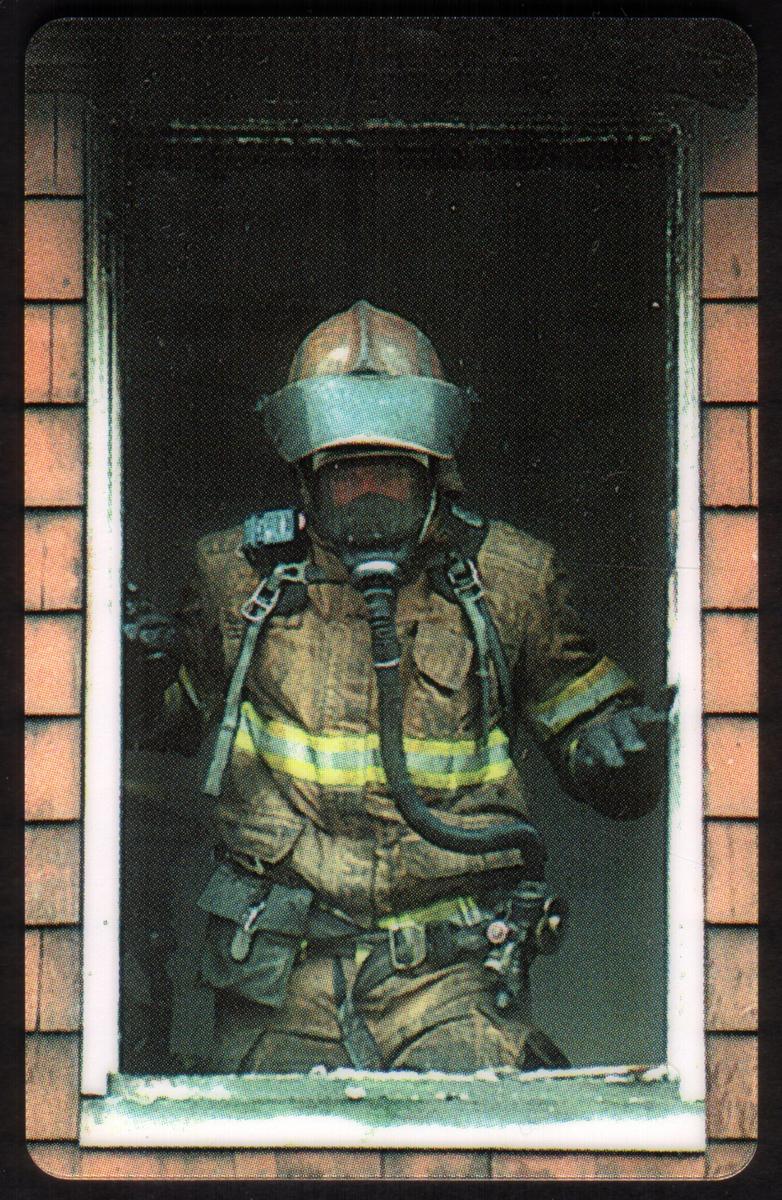 This collectible phone card features a firefighter dressed in full turnout gear standing in a window frame. The fireman wears a protective helmet and a self-contained breathing apparatus with a mask connected by a hose, covering the face completely. The firefighter's jacket is brown with two horizontal reflective yellow-gray stripes across the chest and arms, designed for visibility and safety during fire rescue operations.