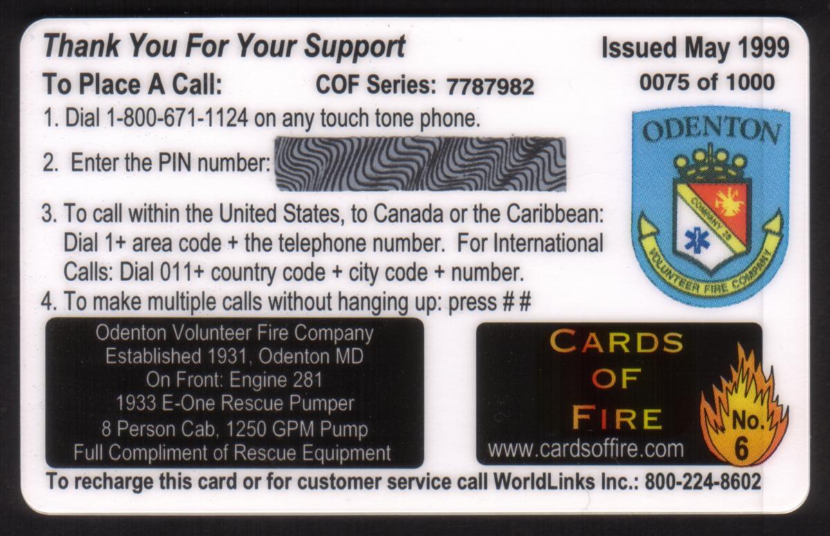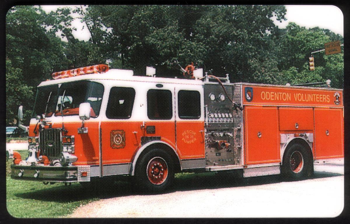 This fire truck is associated with the Odenton Volunteer Fire Company, a non-profit volunteer fire department. The image captures the truck from the driver’s side, highlighting its classic engineering and readiness for duty. This collectible card is linked to Americana and safety themes, focusing on volunteer fire services and their important role in transportation and emergency response.